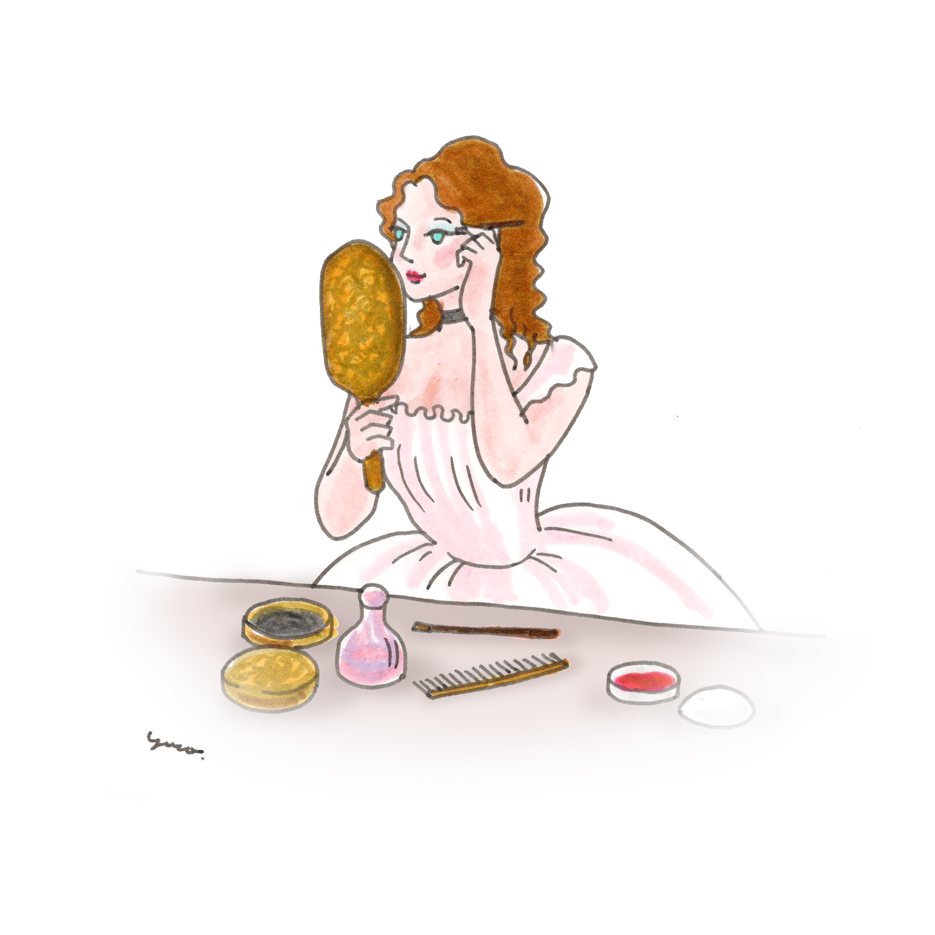 では、メイクの手順に沿いながら、メイク用品を見て行きましょう。土台となるスキンケアには、ローズウォーター、ラベンダー水、オレンジフラワー水を。保湿のためにはグリセリン、アーモンド油、オリーブ油などを塗ります。顔色を整える白粉としては、前述の通り鉛白が使用された白粉を使用し、仕上げに米粉や澱粉を薄くはたいていたこともあるそう。1866年には、鉛白の代わりに肌を痛めず無害な亜鉛華白粉が開発され、以降は長期間使用しても危険性のない白粉が広まっていきました。「血色の良さ」として必要なチークや口紅には、コチニールという昆虫由来の赤い色素が使われていました。これをチークの場合は頬に塗り、口紅にはラードなどの油脂や蜜蝋に混ぜて、鮮やかな赤色を出します。アイラインやアイブロウには、燃やしたランプの煤などが使われたそう。また、植物色素を使った口紅やチーク、オイルやクリーム類も使用されていました。