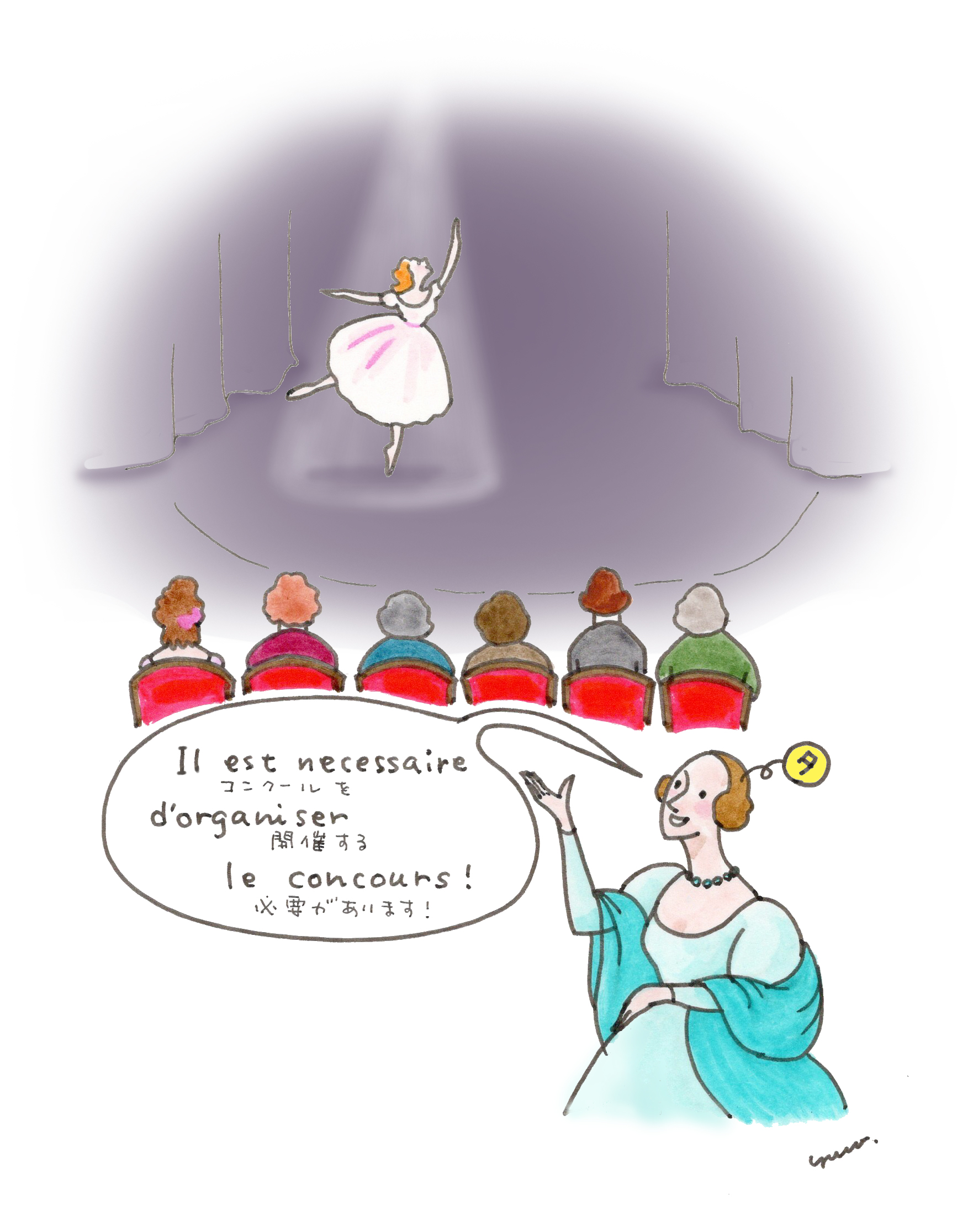 さらに、コリフェおよびカドリーユは人数が決められていたうえに、それぞれの階級の中もまた細分化されており(本連載の第43回参照)、報酬額が微妙に異なる、という特徴がありました。一つ立場が下がるごとに100フラン、報酬額が下がっていくのですが、大雑把に1フラン=現在の日本円で1000円くらい、という計算なので、下位のダンサーにとって、より上位の立場になることは、舞台で責任のある役柄を任されるというモチベーションだけでなく、生活を少し楽にする面もありました。では、ダンサーの生活にも関わる昇級を決めるコンクールは、どのように導入されたのでしょうか?