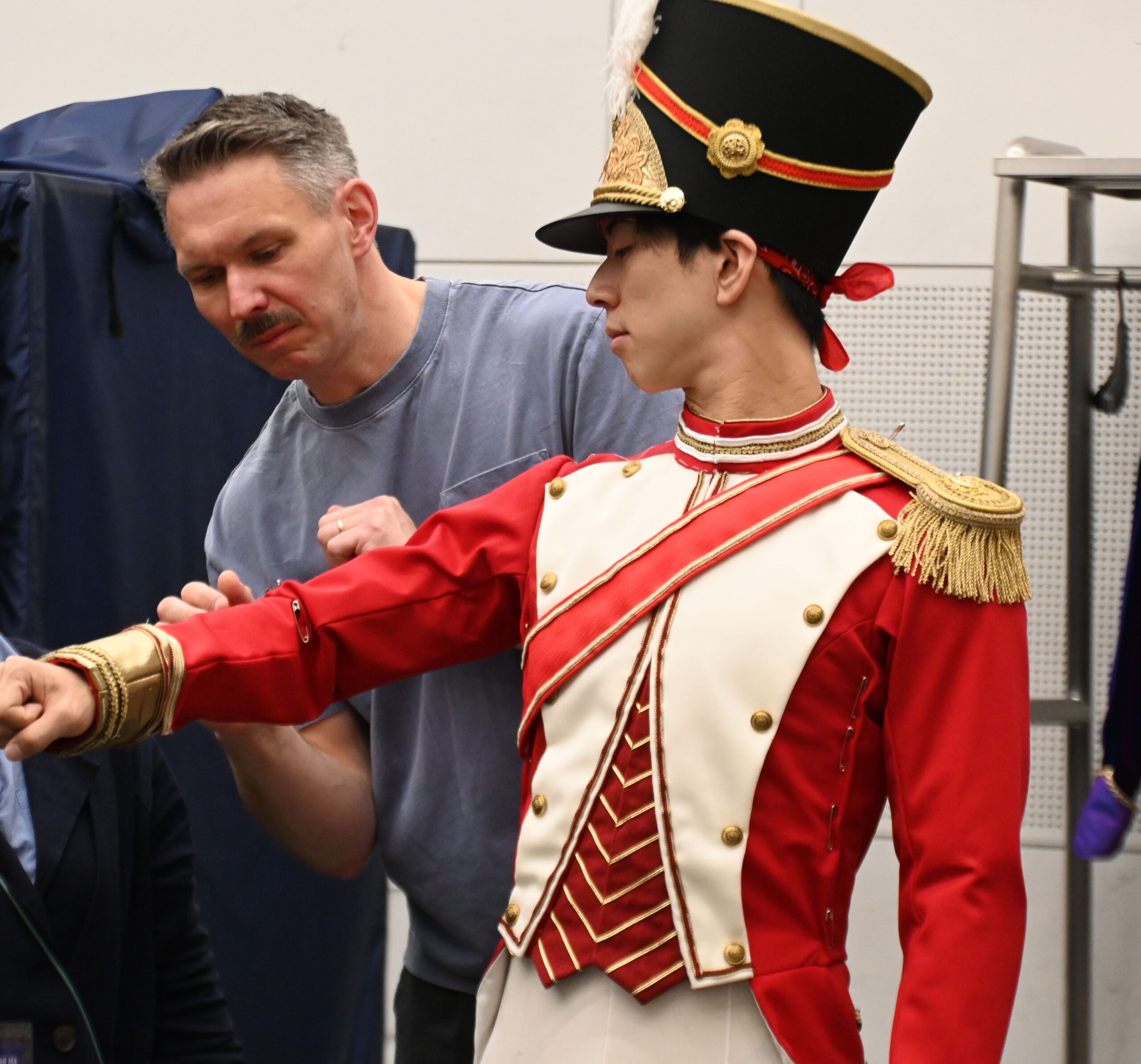 美術・衣裳を手がけるのはコリン・リッチモンド。写真は衣裳の試作品を確認するリッチモンド氏と、ドロッセルマイヤーの助手/くるみ割り人形/王子を演じる速水渉悟