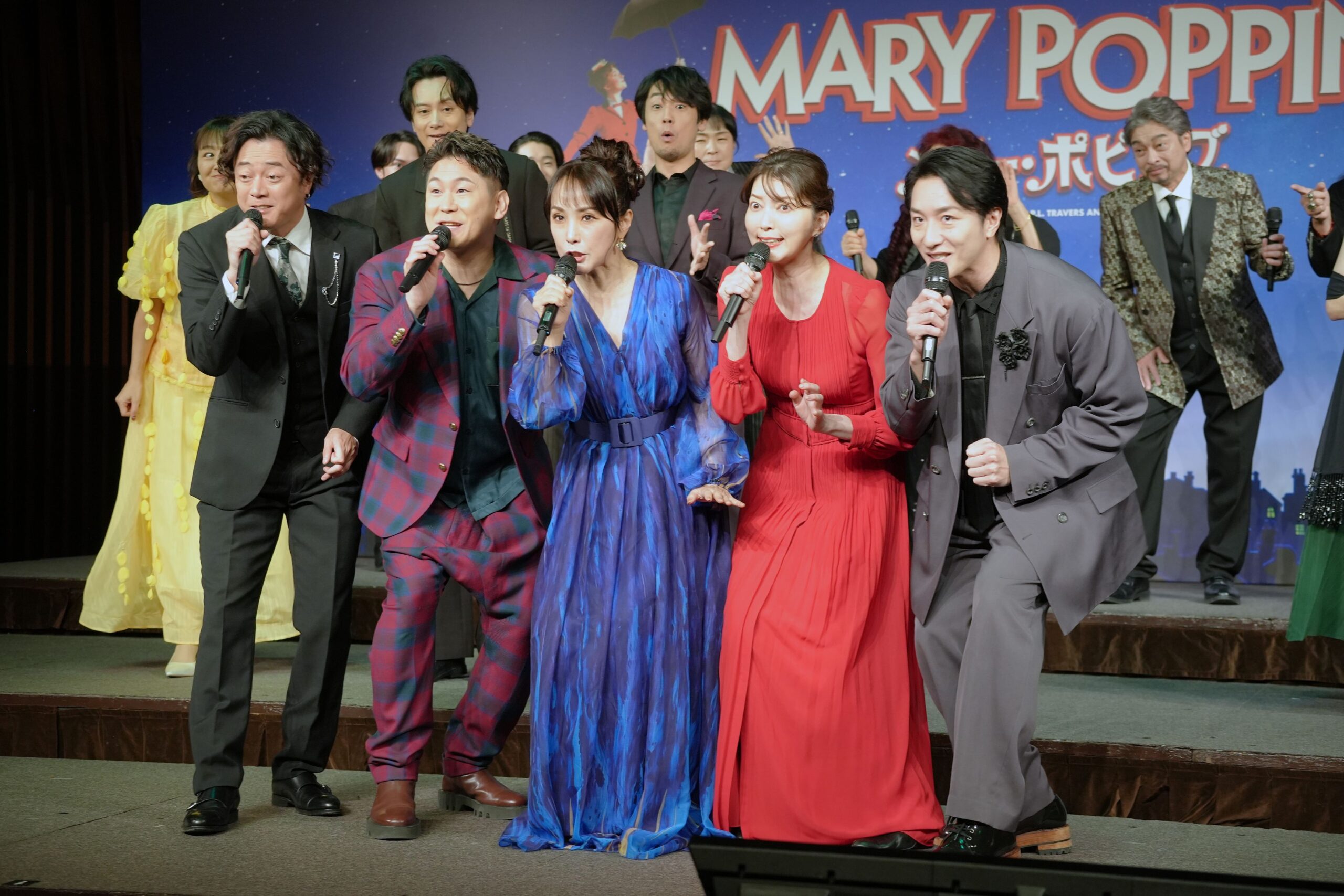 メリー・ポピンズの軽快なソロナンバー。赤と青の華やかなドレスを纏った濱田と朝夏は、時おり微笑みを交わしながら澄んだ歌声を響かせました。