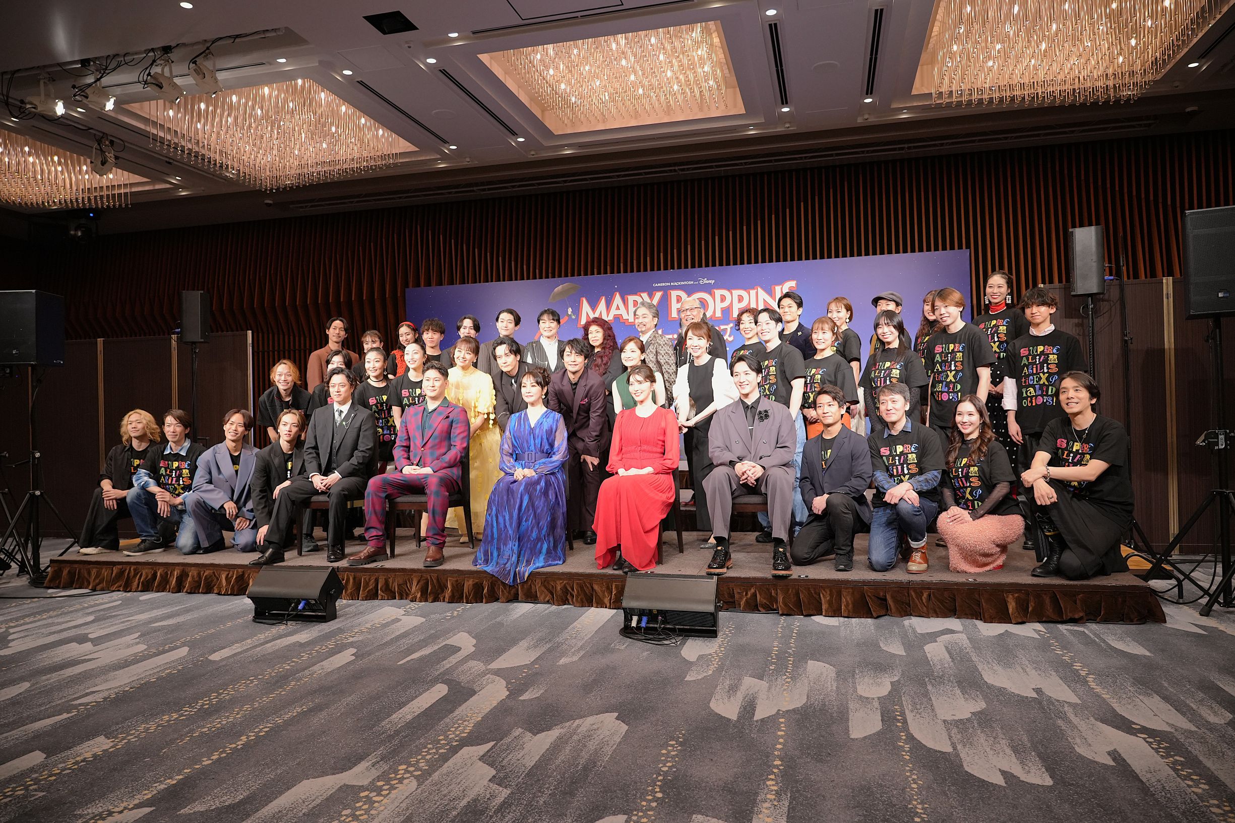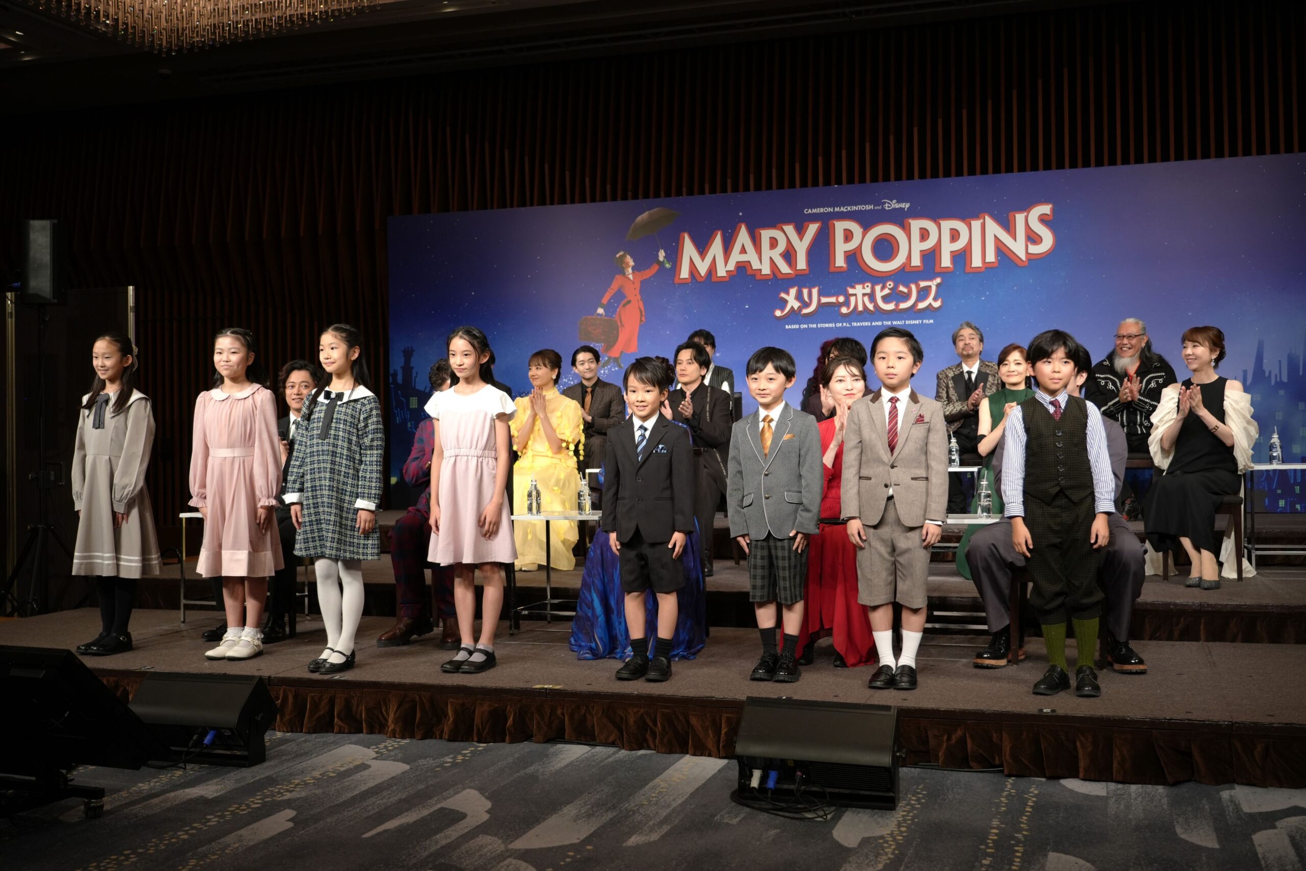 質疑応答が終わると、バンクス家の姉弟、ジェーンとマイケルを演じる子役たち8名が舞台上へ。アンサンブルキャストも再登場。司会者が全員の名前を読み上げ、一人ひとり挨拶しました。