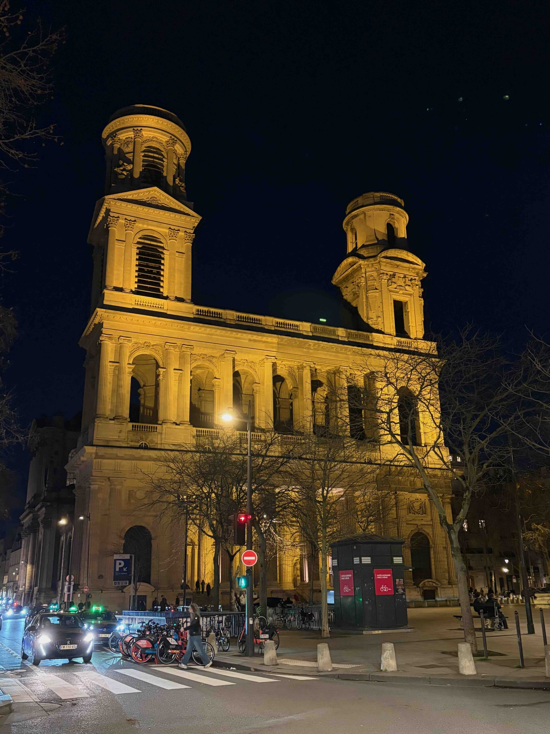 夜のサン=シュルピス教会。正面から見える塔のデザインが、左右で異なるのが特徴的です 写真提供:永井玉藻