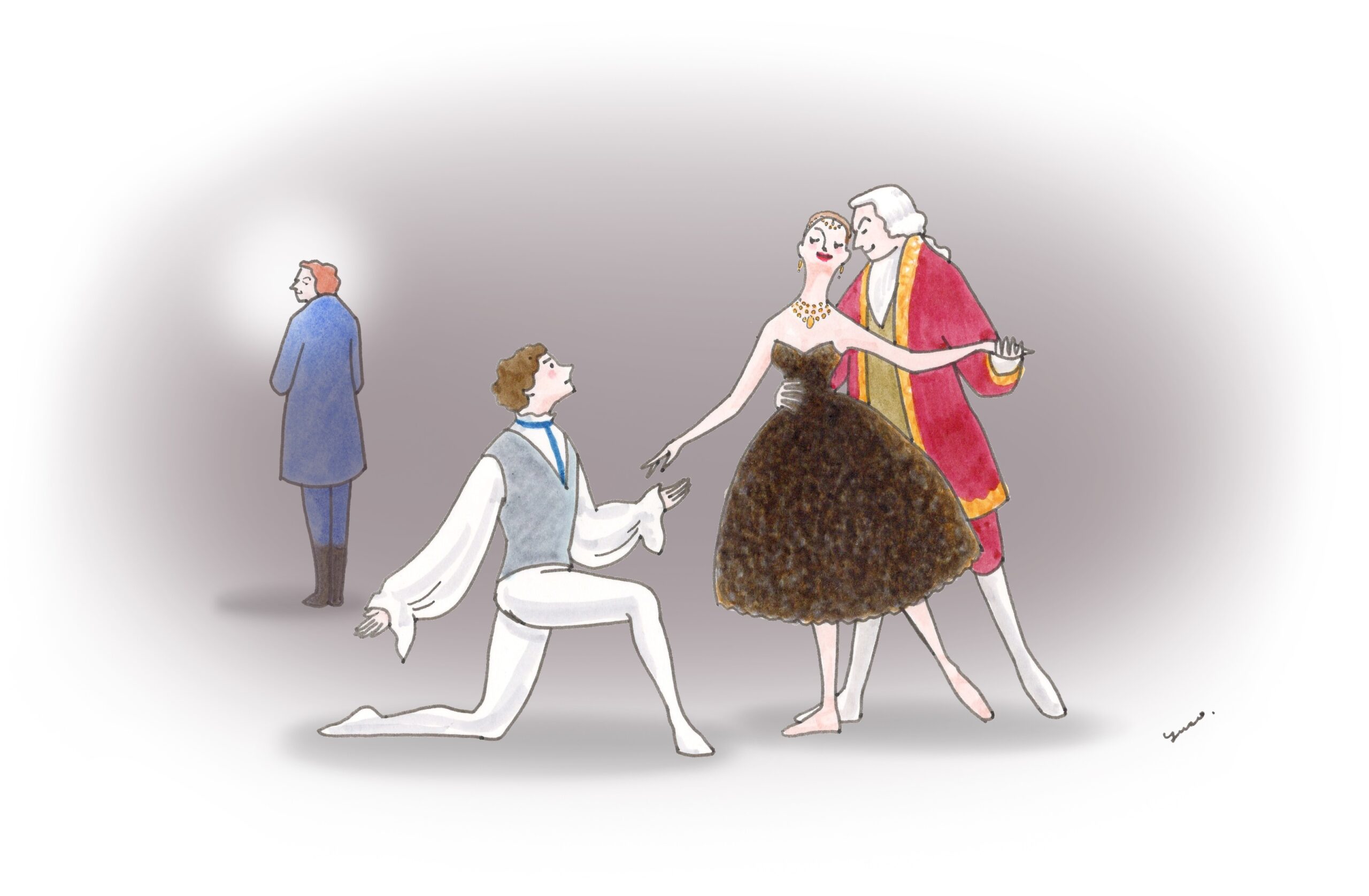 さて、バレエ版の《マノン》において、マノンがデ・グリューの元を去るのは、ムッシューG.M.の愛人になることによります。アミアンからパリに駆け落ちし、幸せに暮らしていた二人(第1幕の「寝室のパ・ド・ドゥ」があるシーンですね)ですが、兄のレスコーに連れられたムッシューG.M.がやってきて、たくさんの贈り物でマノンを誘惑。彼女もデ・グリューへの想いを抱いているものの、宝石や毛皮のマントの魅力に逆らえず、デ・グリューの留守中にアパルトマンから去っていく……というのがバレエ版の流れです。